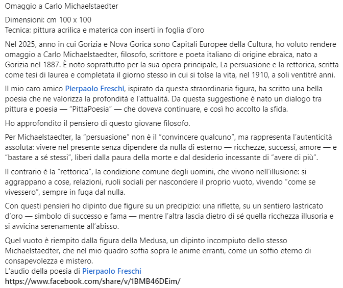 Tecnica: Acrilico, pittura e spatolato con inserti di foglia d’oro 23 K Opera ispirata ad una poesia di Pierpaolo Freschi:17/01/2024 |